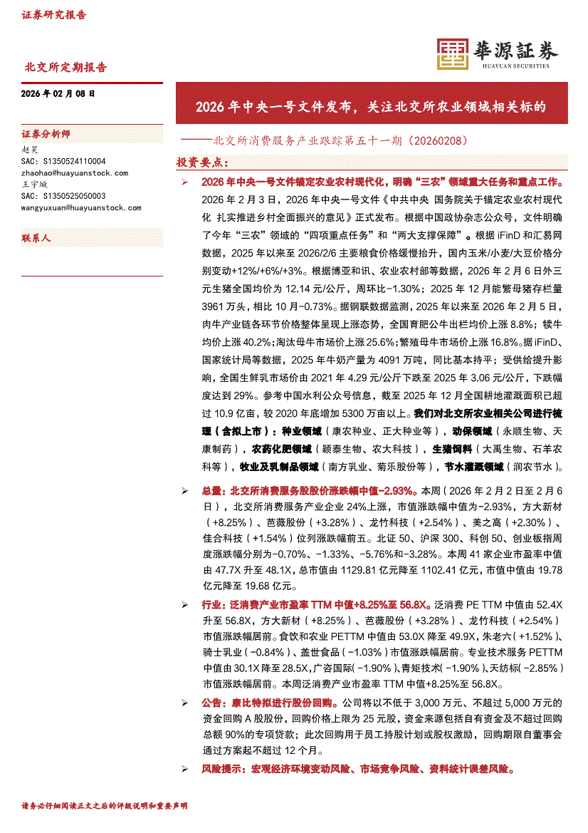 华源证券-北交所消费服务产业跟踪第五十一期:2026年中央一号文件发布,关注北交所农业领域相关标的-260208