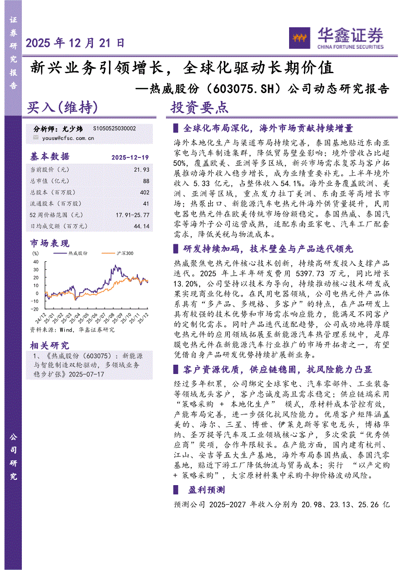 热威股份:华鑫证券-热威股份-603075-公司动态研究报告:新兴业务引领增长,全球化驱动长期价值-251221