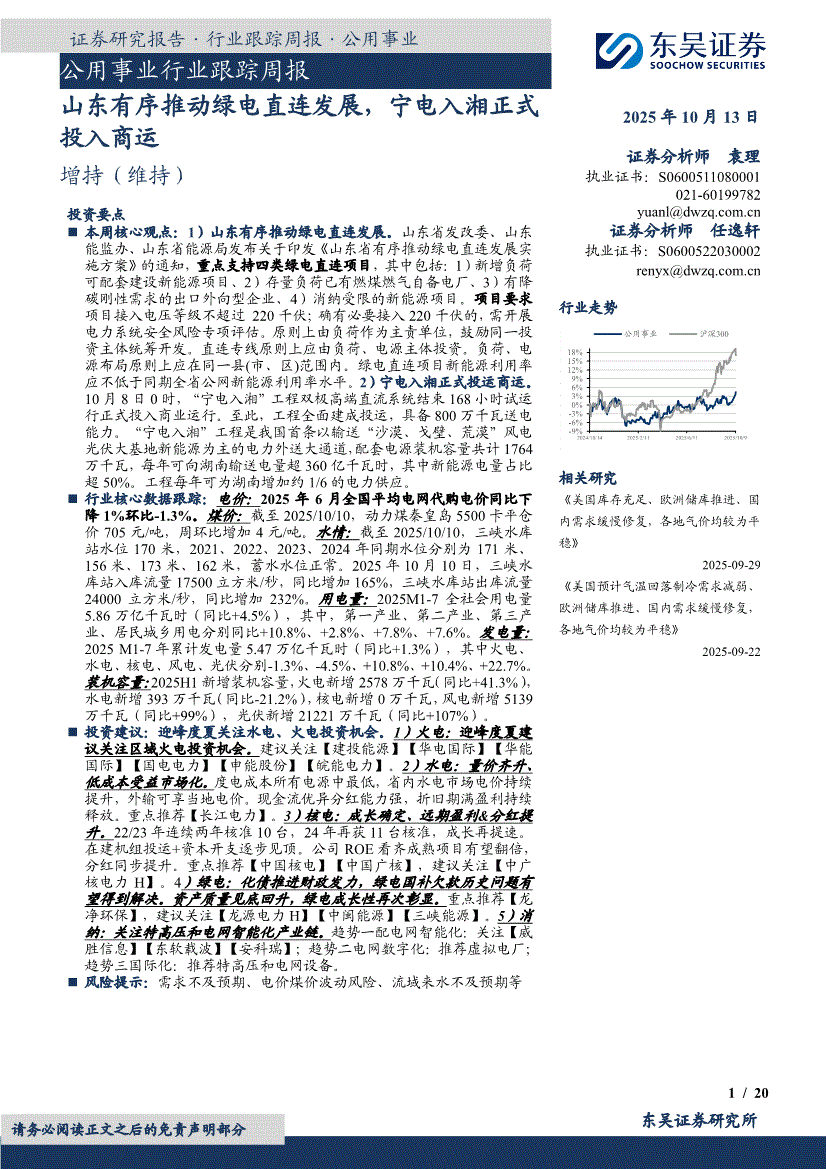 公用事业行业:东吴证券-公用事业行业跟踪周报:山东有序推动绿电直连发展,宁电入湘正式投入商运-251013