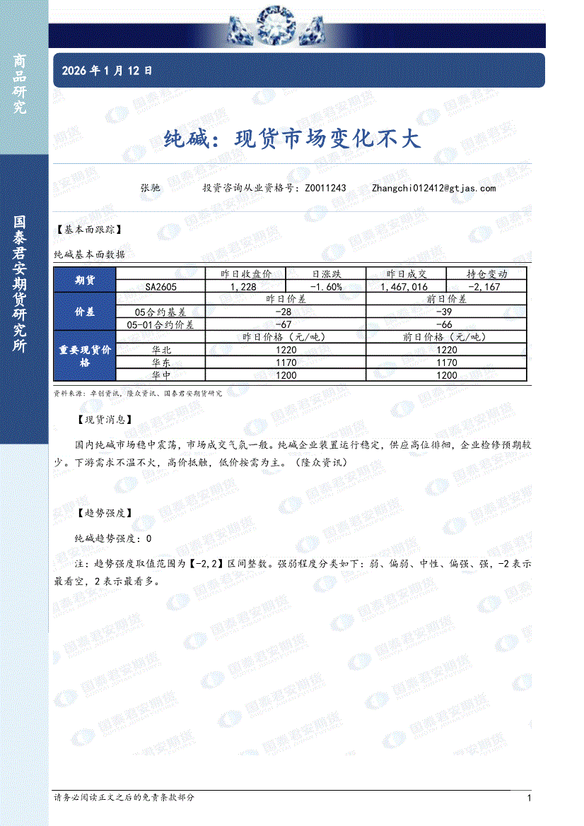 国泰君安期货-纯碱:现货市场变化不大-260112