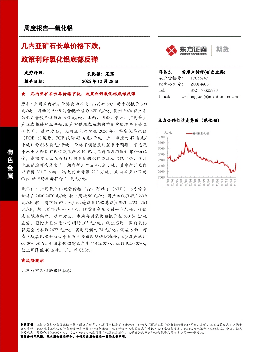 东证期货-氧化铝周度报告:几内亚矿石长单价格下跌,政策利好氧化铝底部反弹-251228