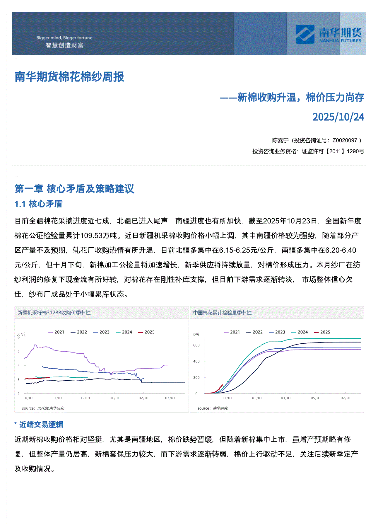 南华期货-棉花棉纱周报:新棉收购升温,棉价承压尚存-251024