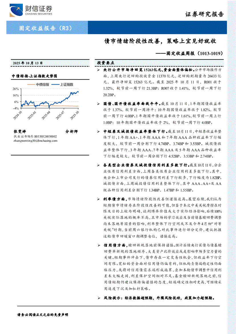 财信证券-固定收益周报:债市情绪阶段性改善,策略上宜见好就收-251013