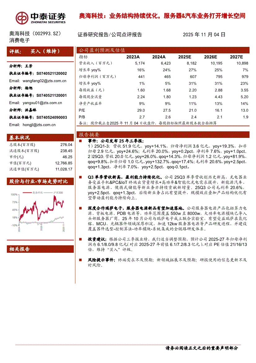 奥海科技:中泰证券-奥海科技-002993-业务结构持续优化,服务器&汽车业务打开增长空间-251104