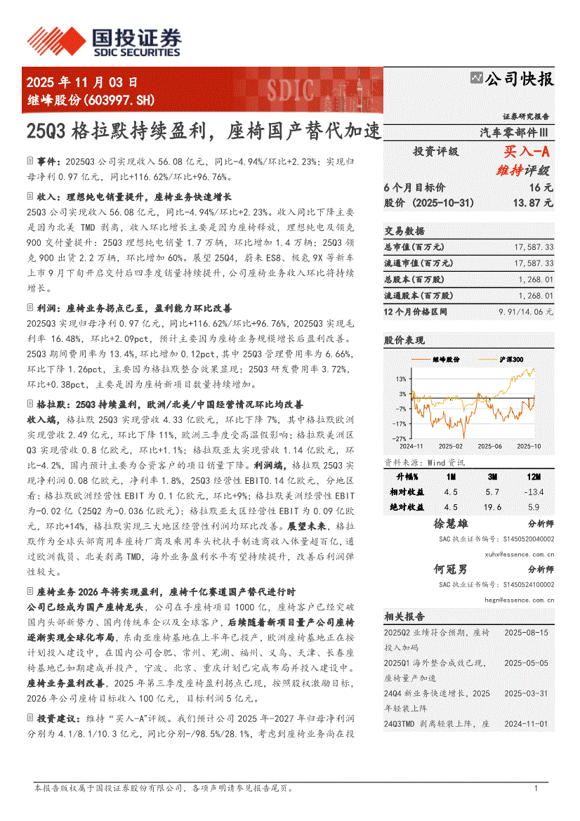 继峰股份:国投证券-继峰股份-603997-25Q3格拉默持续盈利,座椅国产替代加速-251103