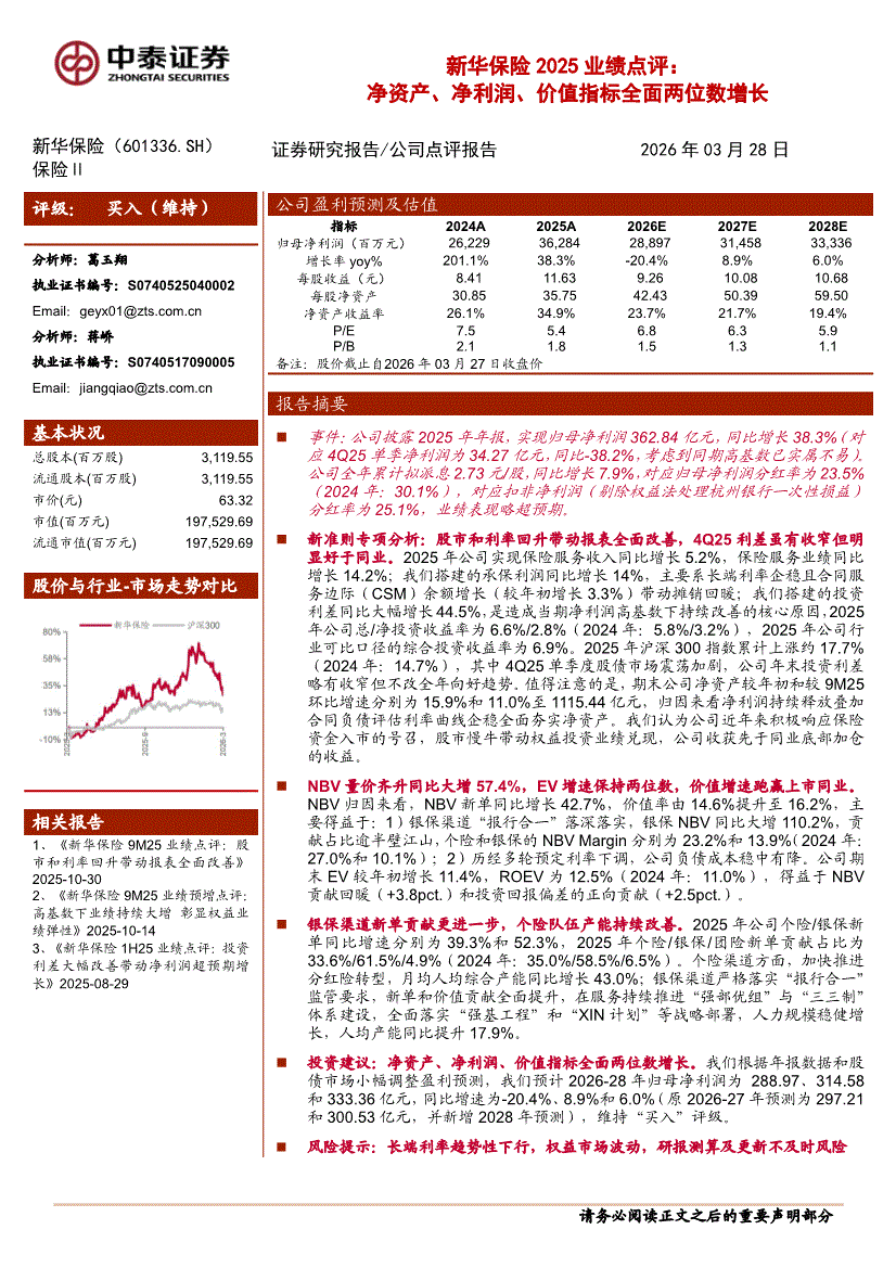 新华保险:中泰证券-新华保险-601336-2025业绩点评:净资产、净利润、价值指标全面两位数增长-260328
