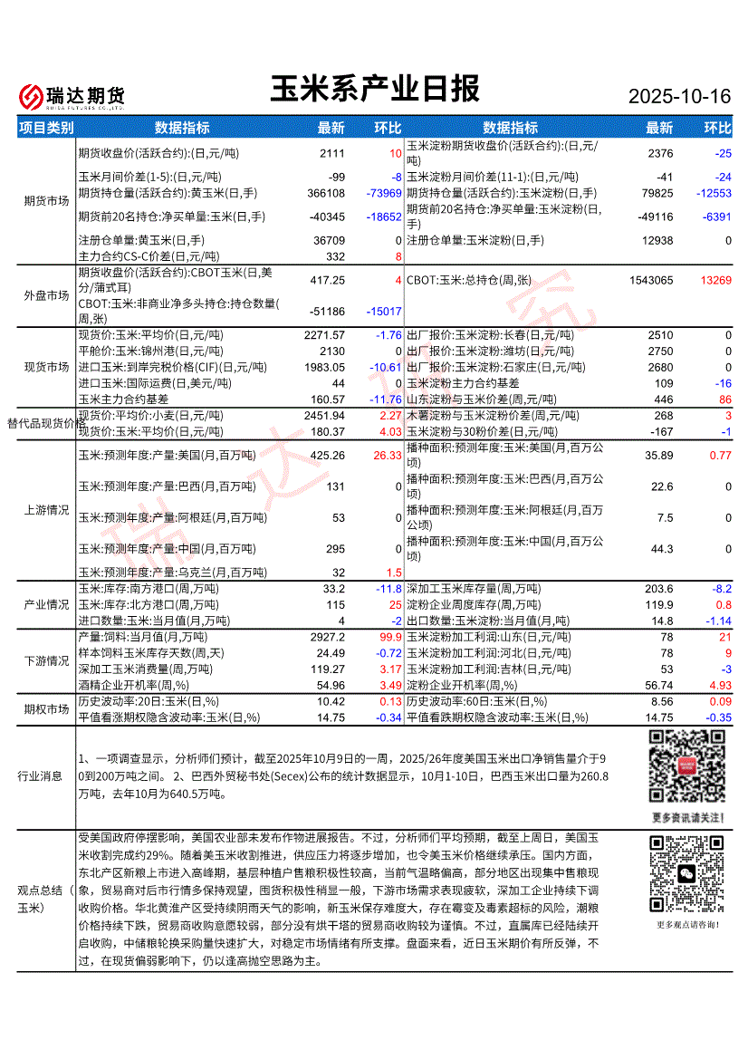 瑞达期货-玉米类市场周报:收割推进现货走弱,期价维持偏弱调整-251010