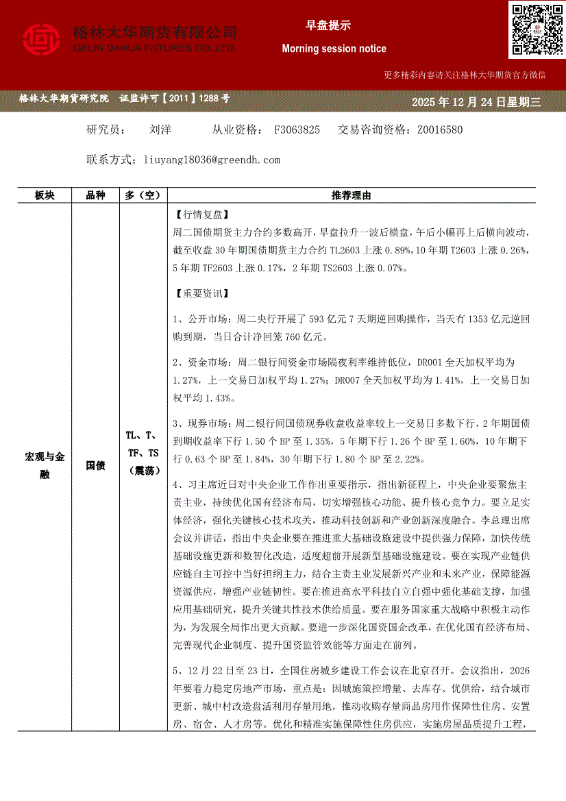 格林大华期货-国债早盘提示-251224