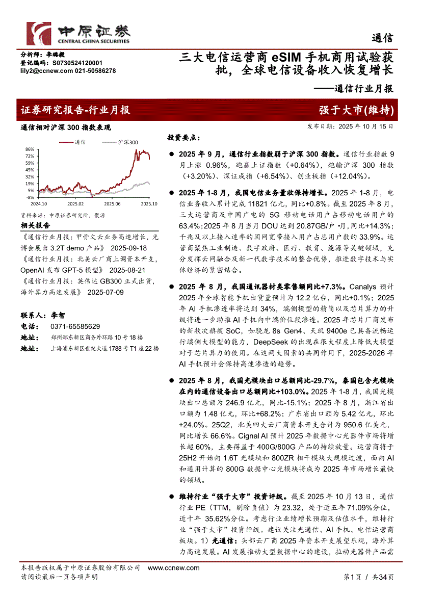 通信行业:中原证券-通信行业月报:三大电信运营商eSIM手机商用试验获批,全球电信设备收入恢复增长-251015