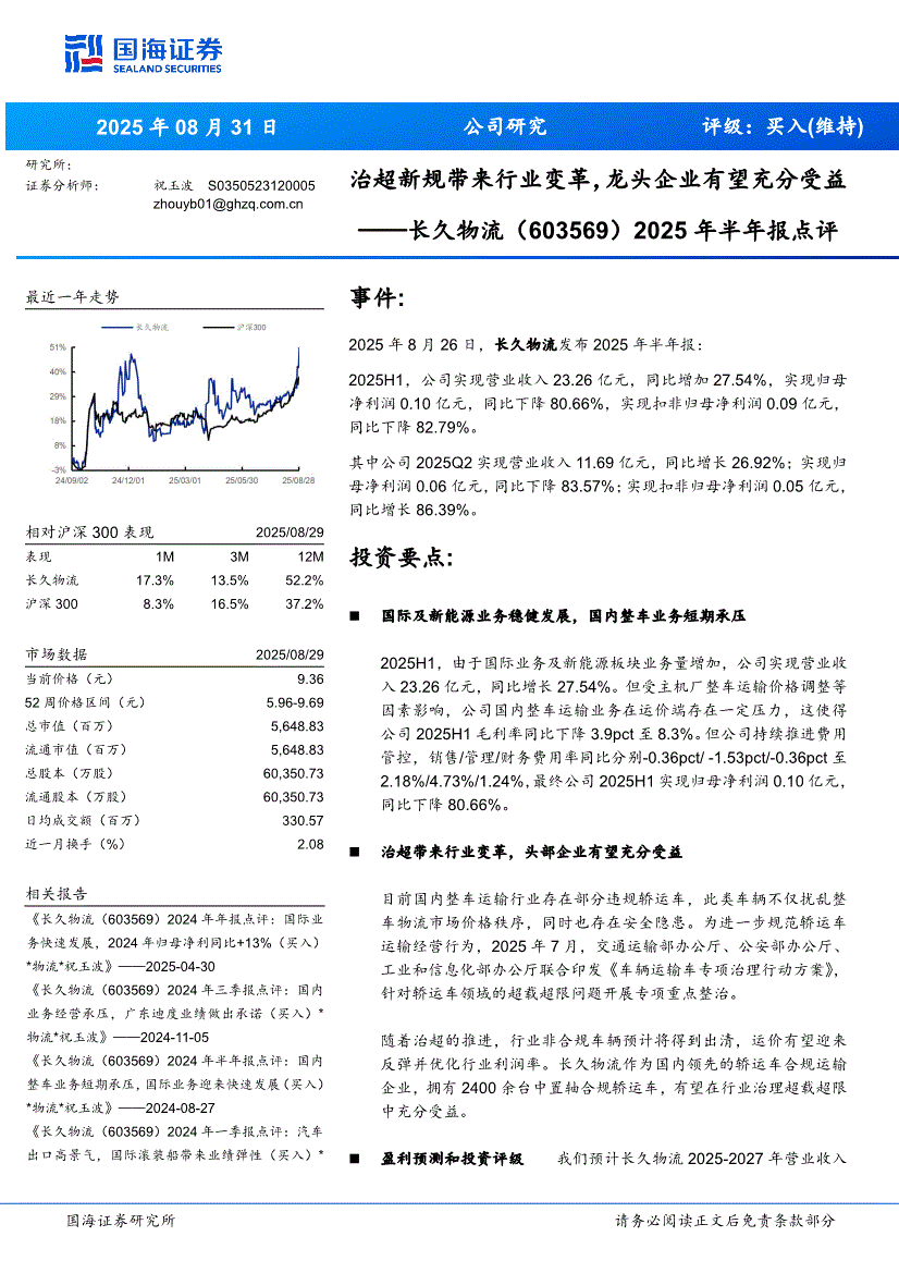长久物流:国海证券-长久物流-603569-2025年半年报点评:治超新规带来行业变革,龙头企业有望充分受益-250831