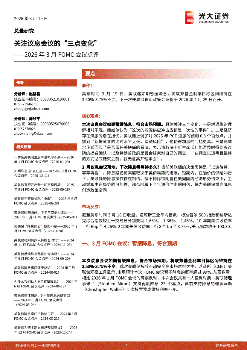 光大证券-2026年3月FOMC会议点评:关注议息会议的“三点变化”-260319