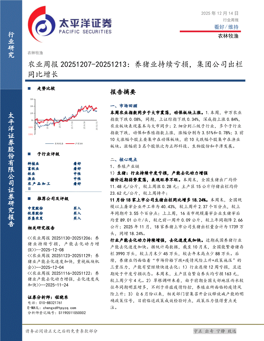 农林牧渔行业:太平洋证券-农业周报:养猪业持续亏损,集团公司出栏同比增长-251214