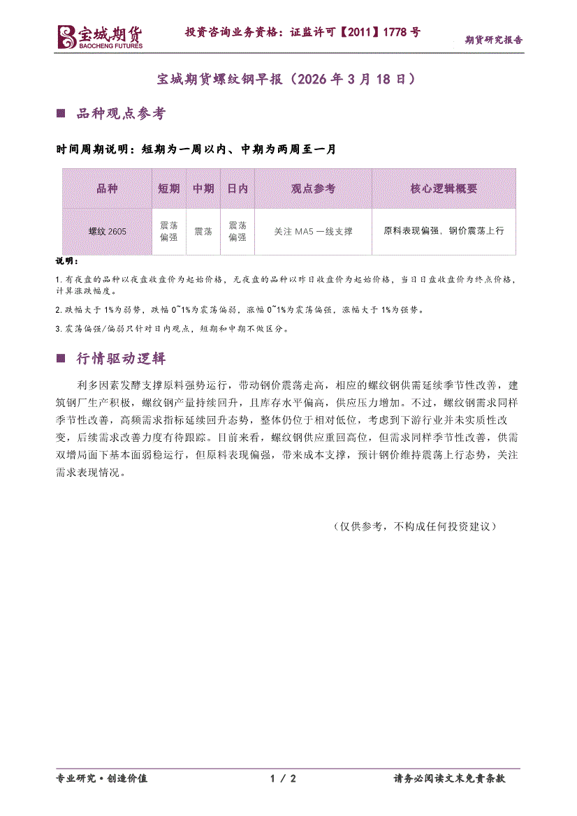 宝城期货-螺纹钢早报-260318