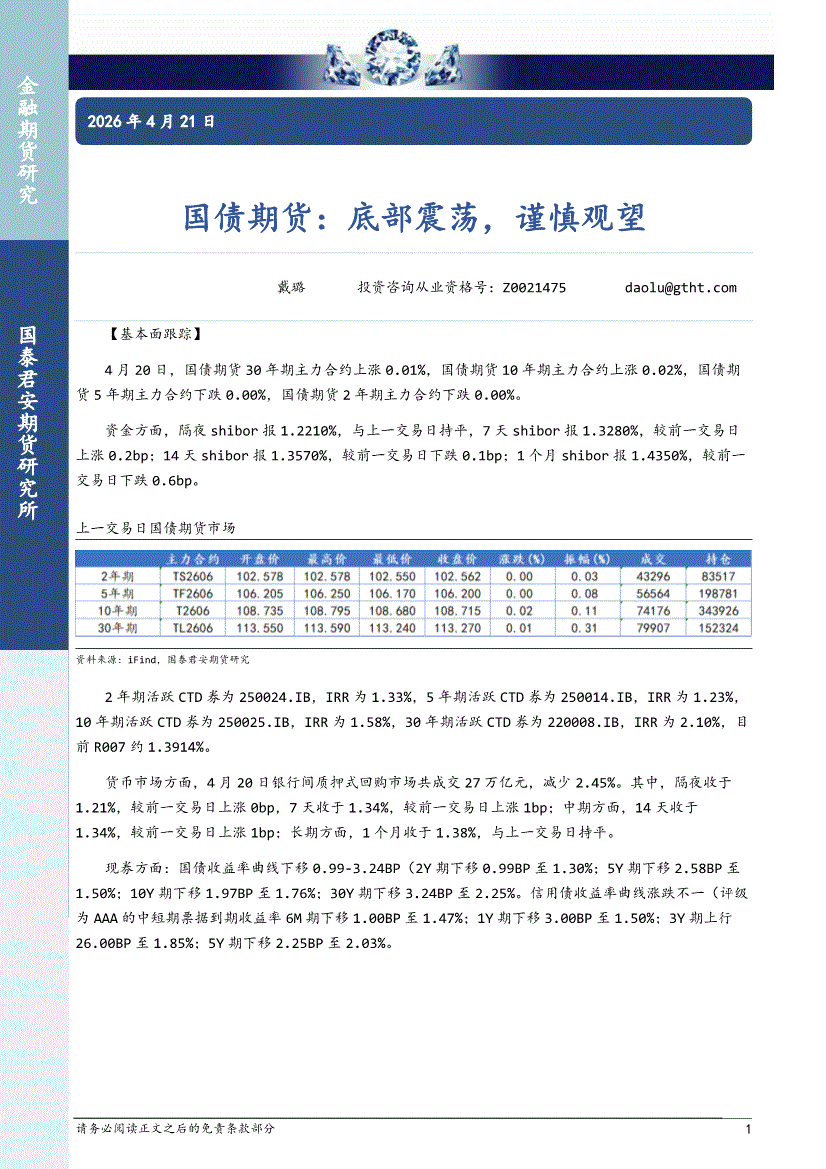 国泰君安期货-国债期货:底部震荡,谨慎观望-260421