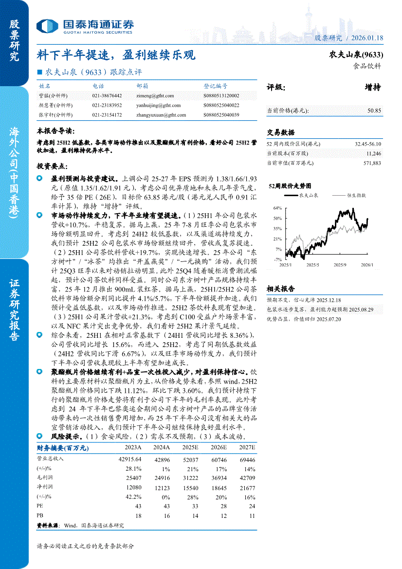 农夫山泉:国泰海通证券-农夫山泉-9633.HK-跟踪点评:料下半年提速,盈利继续乐观-260118