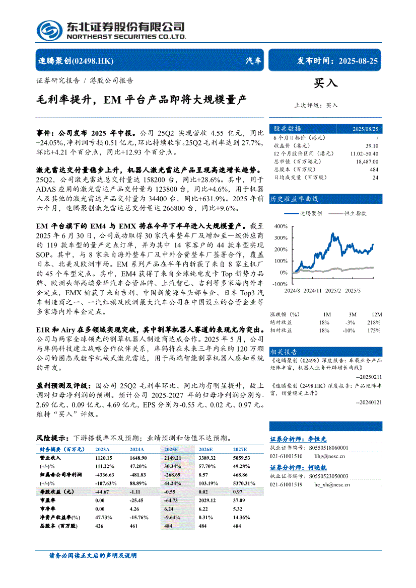 速腾聚创:东北证券-速腾聚创-2498.HK-毛利率提升,EM平台产品即将大规模量产-250825