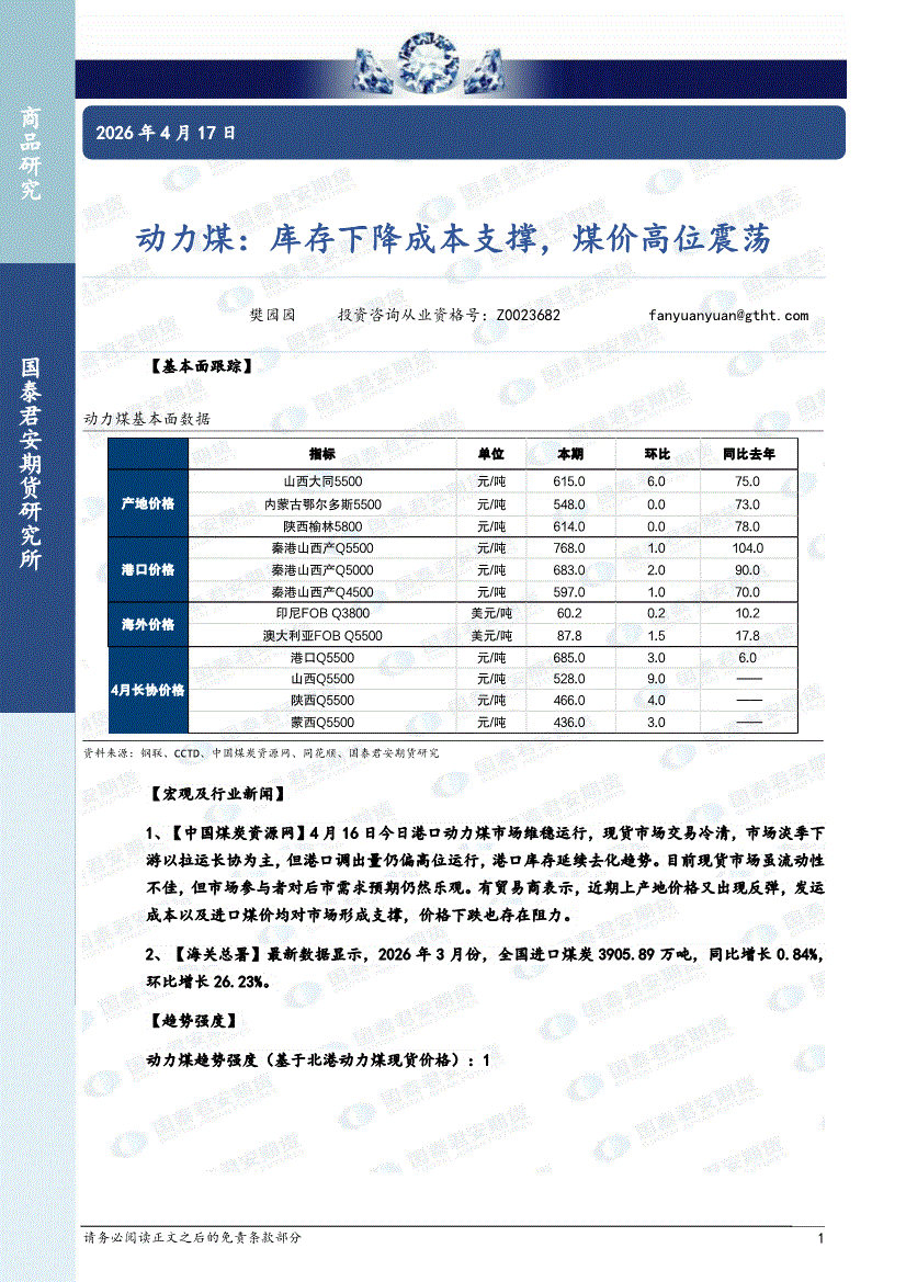 国泰君安期货-动力煤:库存下降成本支撑,煤价高位震荡-260417