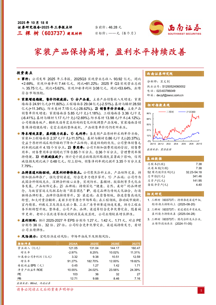 三棵树:西南证券-三棵树-603737-家装产品保持高增,盈利水平持续改善-251018