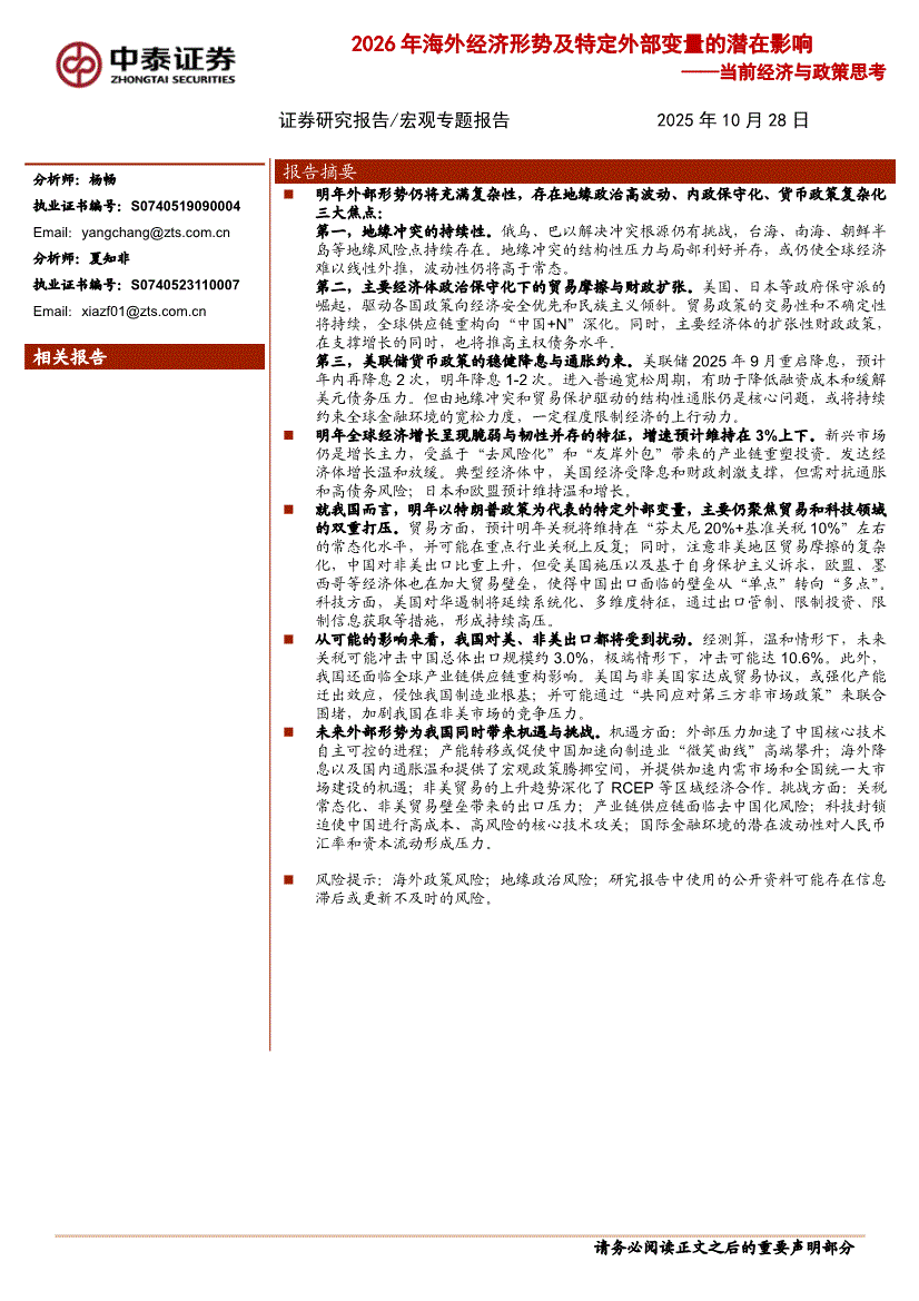 中泰证券-当前经济与政策思考:2026年海外经济形势及特定外部变量的潜在影响-251028