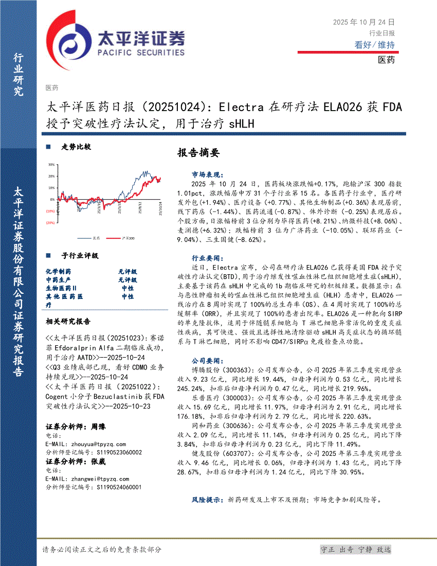 医药行业:太平洋证券-医药行业日报:Electra在研疗法ELA026获FDA授予突破性疗法认定,用于治疗sHLH-251024