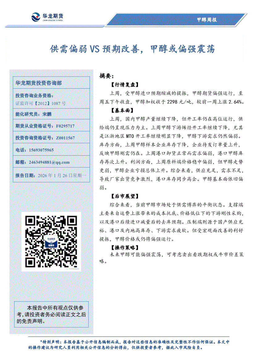 华龙期货-甲醇周报:供需偏弱VS预期改善,甲醇或偏强震荡-260126