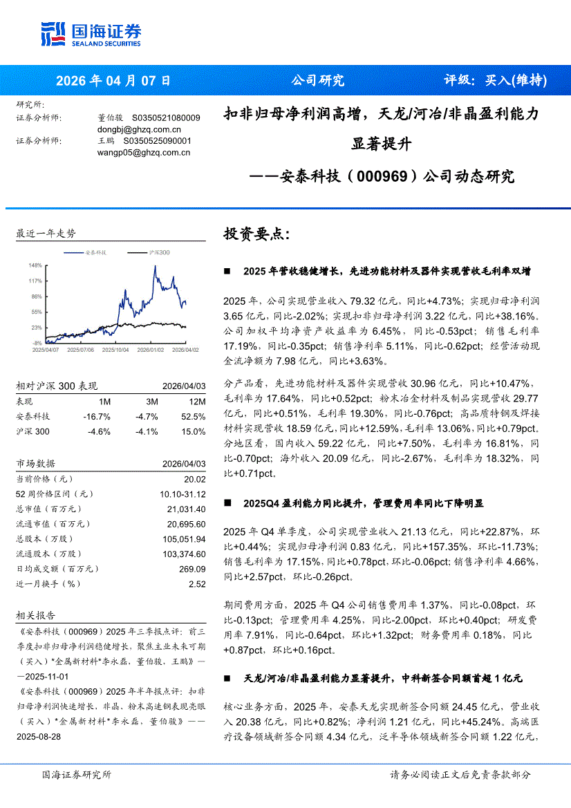 安泰科技:国海证券-安泰科技-000969-公司动态研究:扣非归母净利润高增,天龙/河冶/非晶盈利能力显著提升-260407