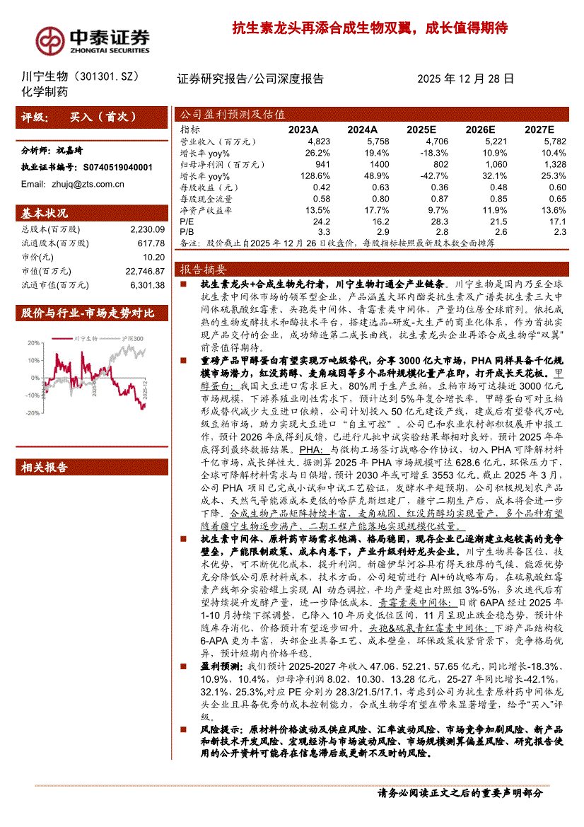 川宁生物:中泰证券-川宁生物-301301-抗生素龙头再添合成生物双翼,成长值得期待-251228