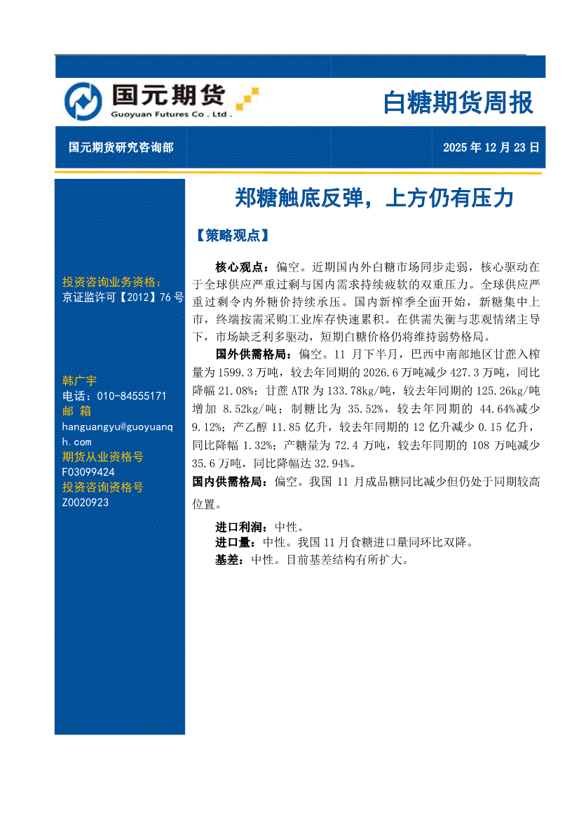 国元期货-白糖期货周报:郑糖触底反弹,上方仍有压力-251223