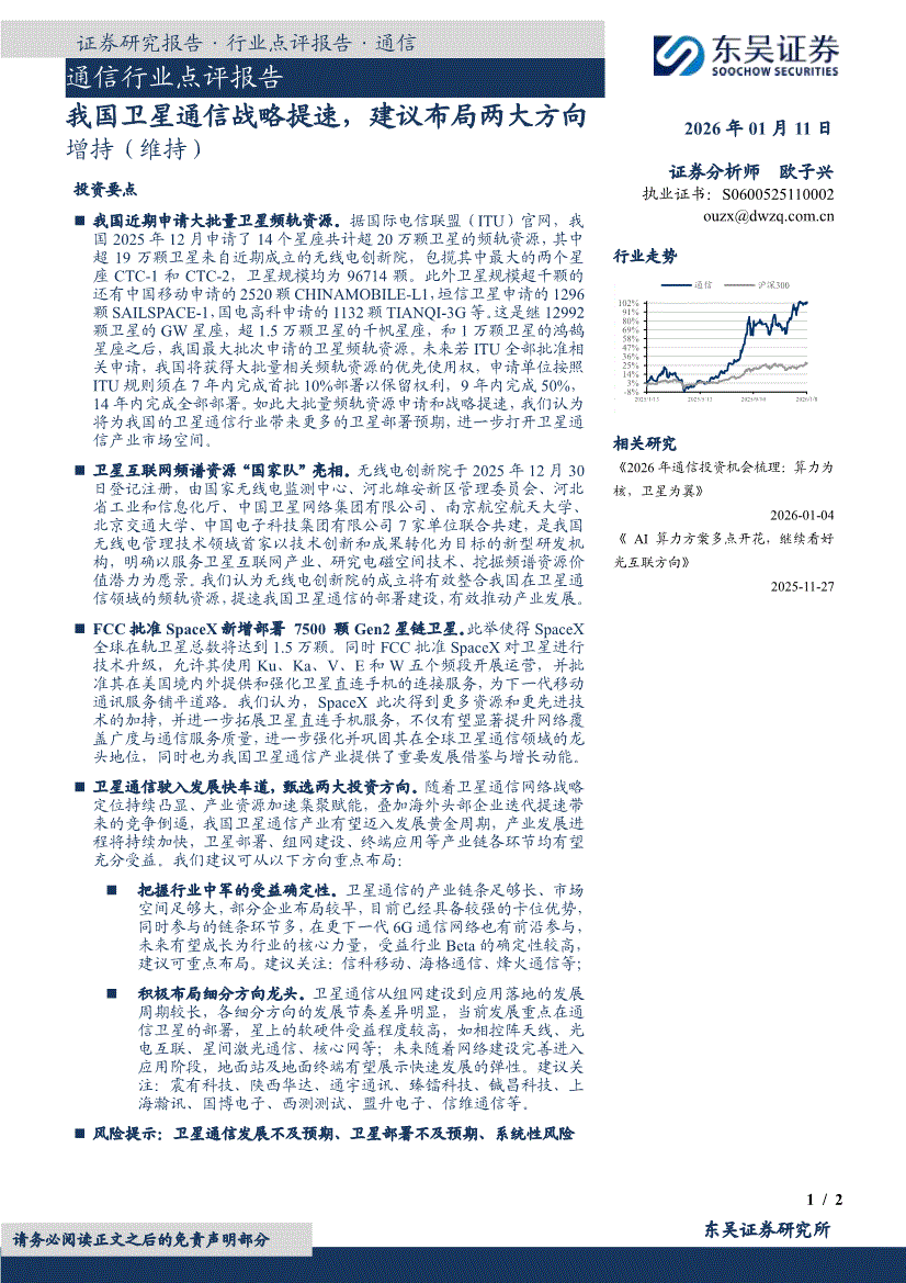 通信行业:东吴证券-通信行业点评报告:我国卫星通信战略提速,建议布局两大方向-260111