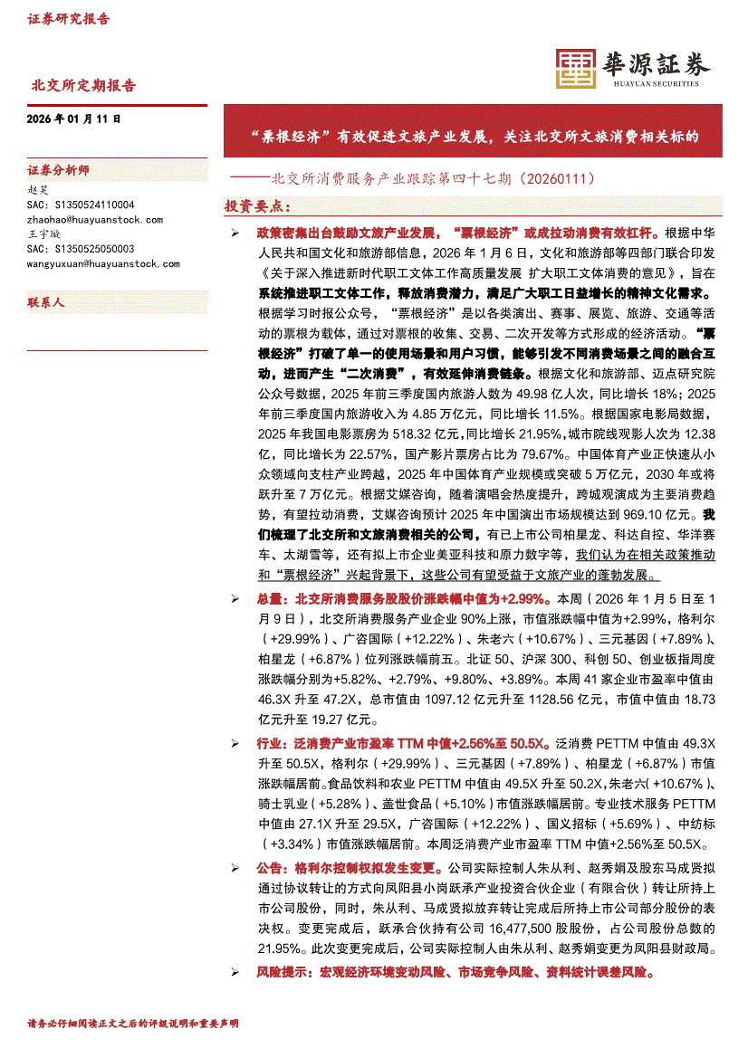 华源证券-北交所消费服务产业跟踪第四十七期:“票根经济”有效促进文旅产业发展,关注北交所文旅消费相关标的-260111
