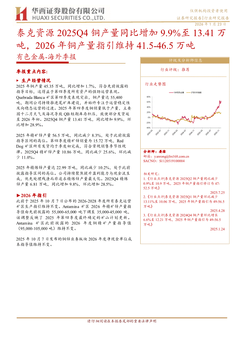 华西证券-有色金属行业~海外季报:泰克资源2025Q4铜产量同比增加9.9%至13.41万吨,2026年铜产量指引维持41.5~46.5万吨-260123