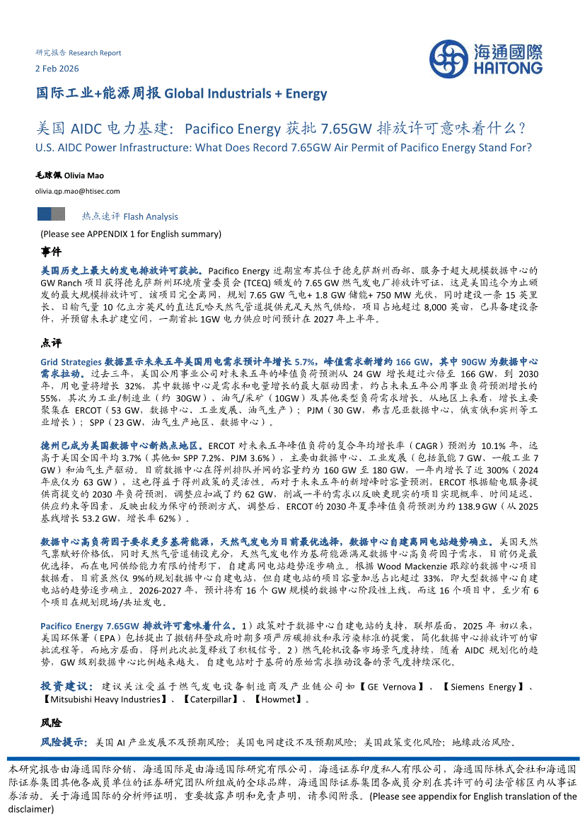 工业+能源行业:海通国际-国际工业+能源行业周报:美国AIDC电力基建,Pacifico Energy获批7.65GW排放许可意味着什么?-260202