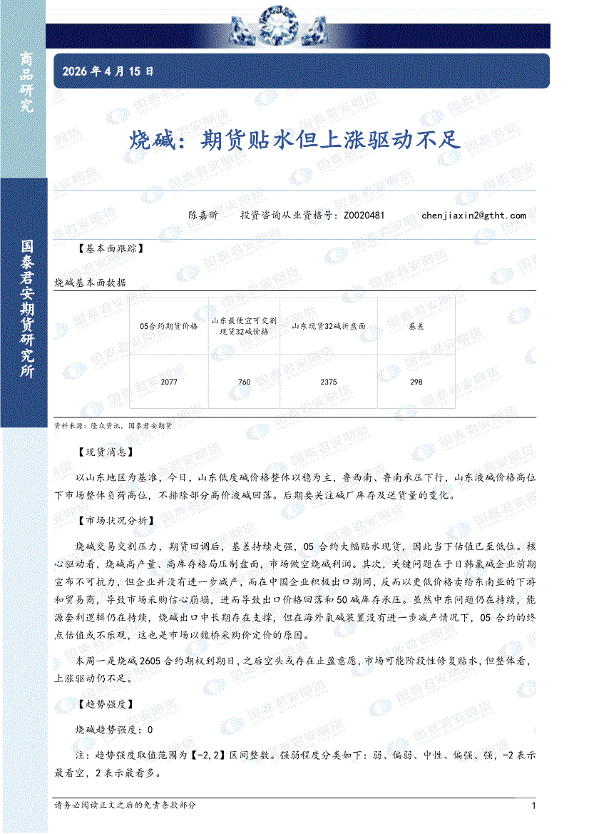 国泰君安期货-烧碱:期货贴水但上涨驱动不足-260414