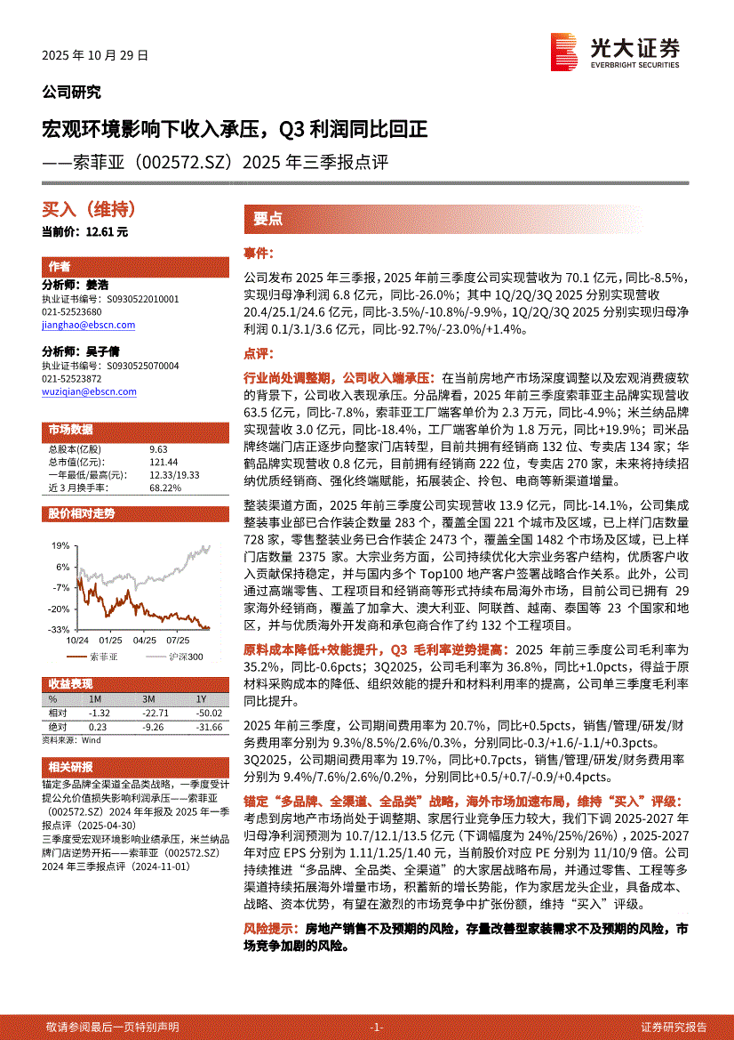 索菲亚:光大证券-索菲亚-002572-2025年三季报点评:宏观环境影响下收入承压,Q3利润同比回正-251029