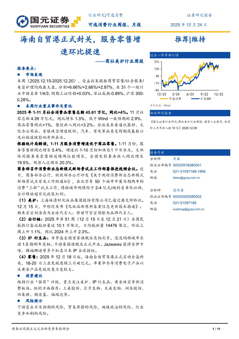商社美护行业:国元证券-商社美护行业周报:海南自贸港正式封关,服务零售增速环比提速-251224