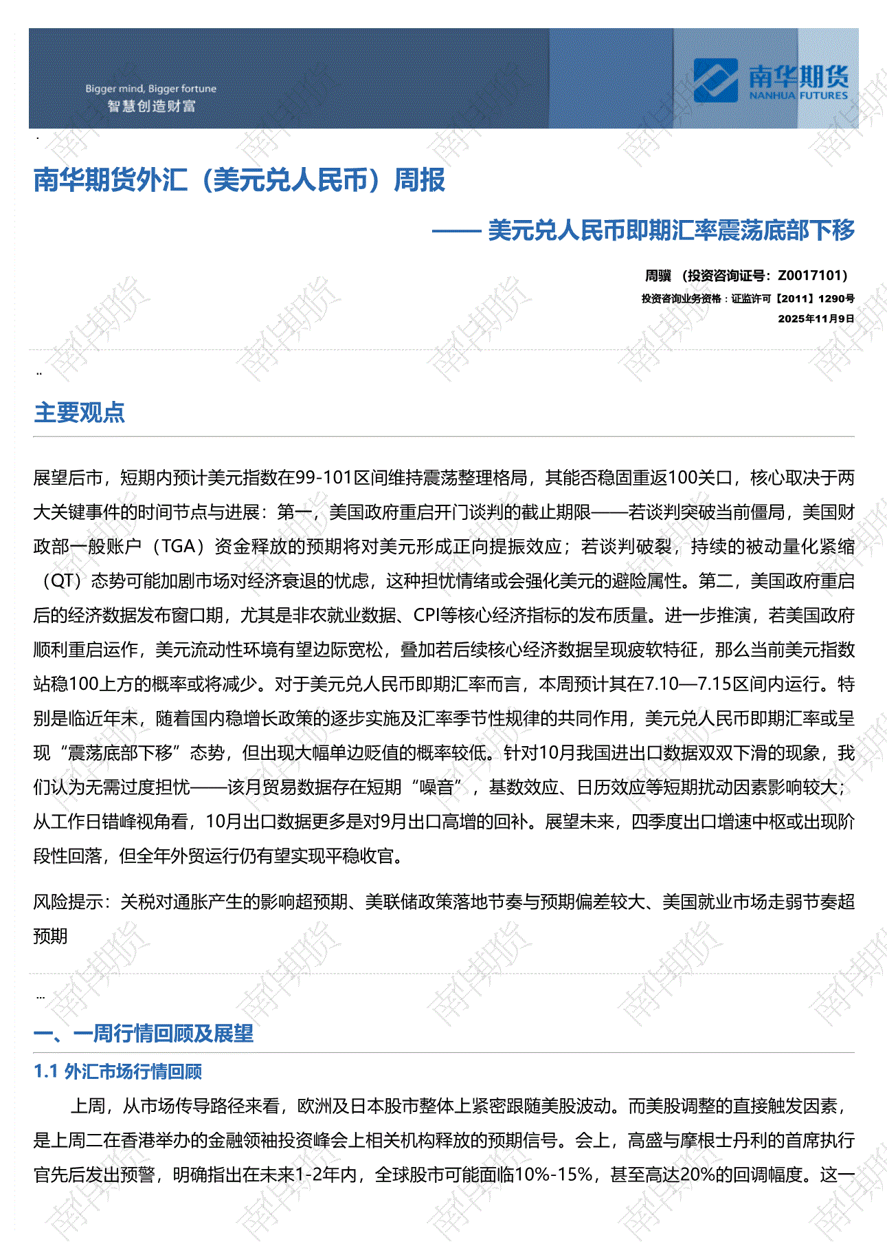 南华期货-外汇(美元兑人民币)周报:美元兑人民币即期汇率震荡底部下移-251109