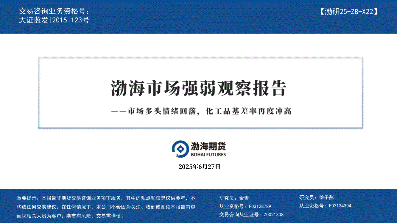 渤海期货-市场强弱观察报告:市场多头情绪回落,化工品基差率再度冲高-250627