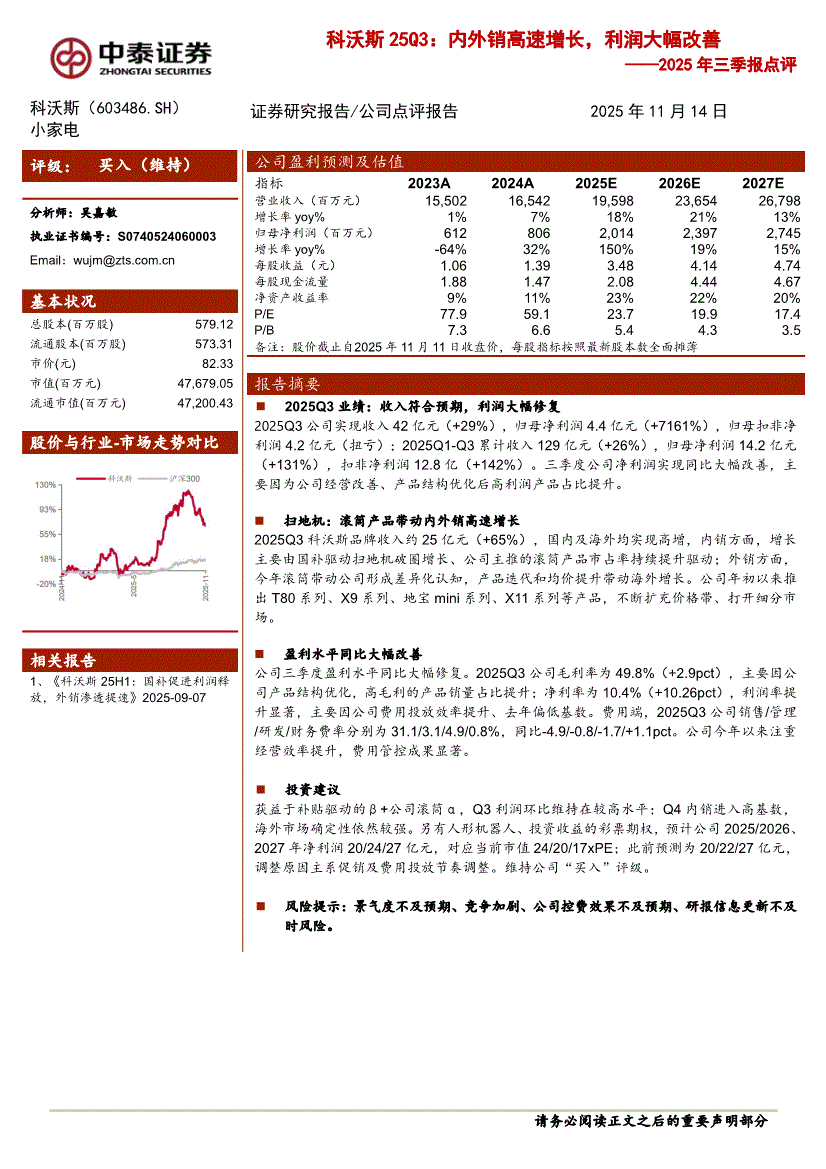 科沃斯:中泰证券-科沃斯-603486-2025年三季报点评:25Q3,内外销高速增长,利润大幅改善-251114