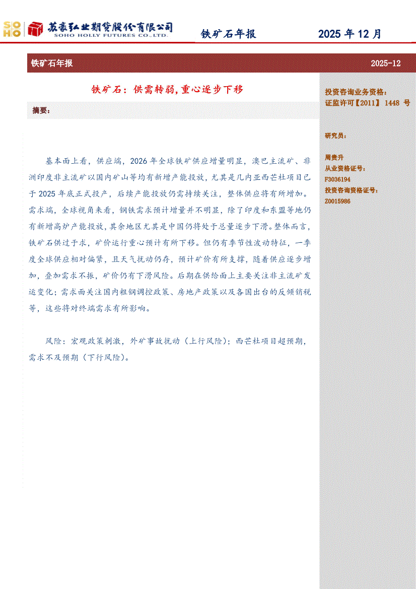 弘业期货-铁矿石年报:供需转弱,重心逐步下移-251215