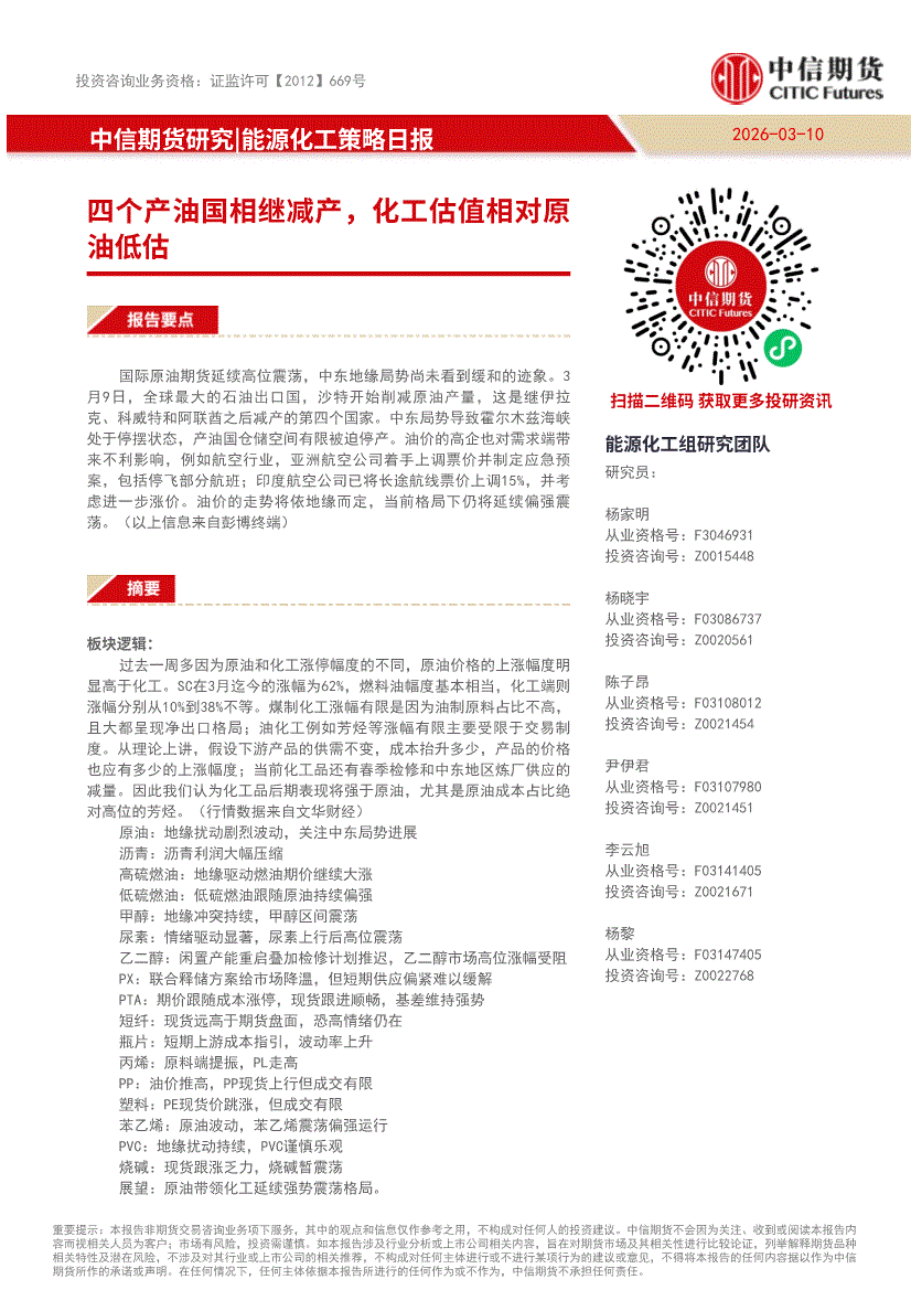 中信期货-能源化工策略日报:四个产油国相继减产,化工估值相对原油低估-260310