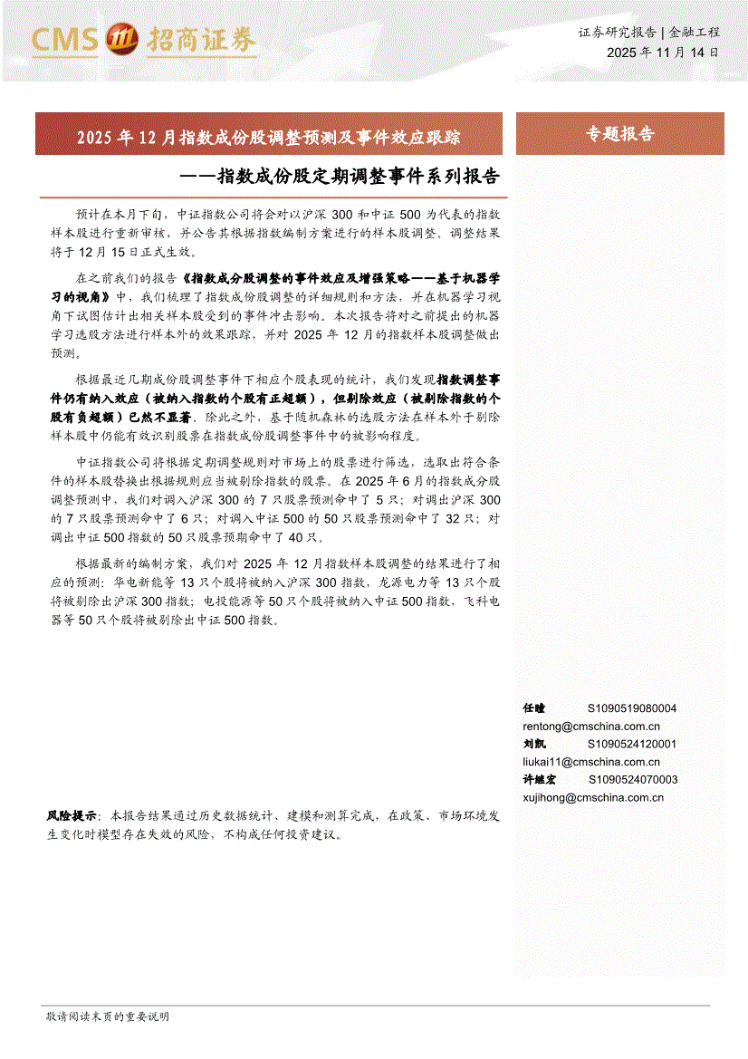 招商证券-指数成份股定期调整事件系列报告:2025年12月指数成份股调整预测及事件效应跟踪-251114