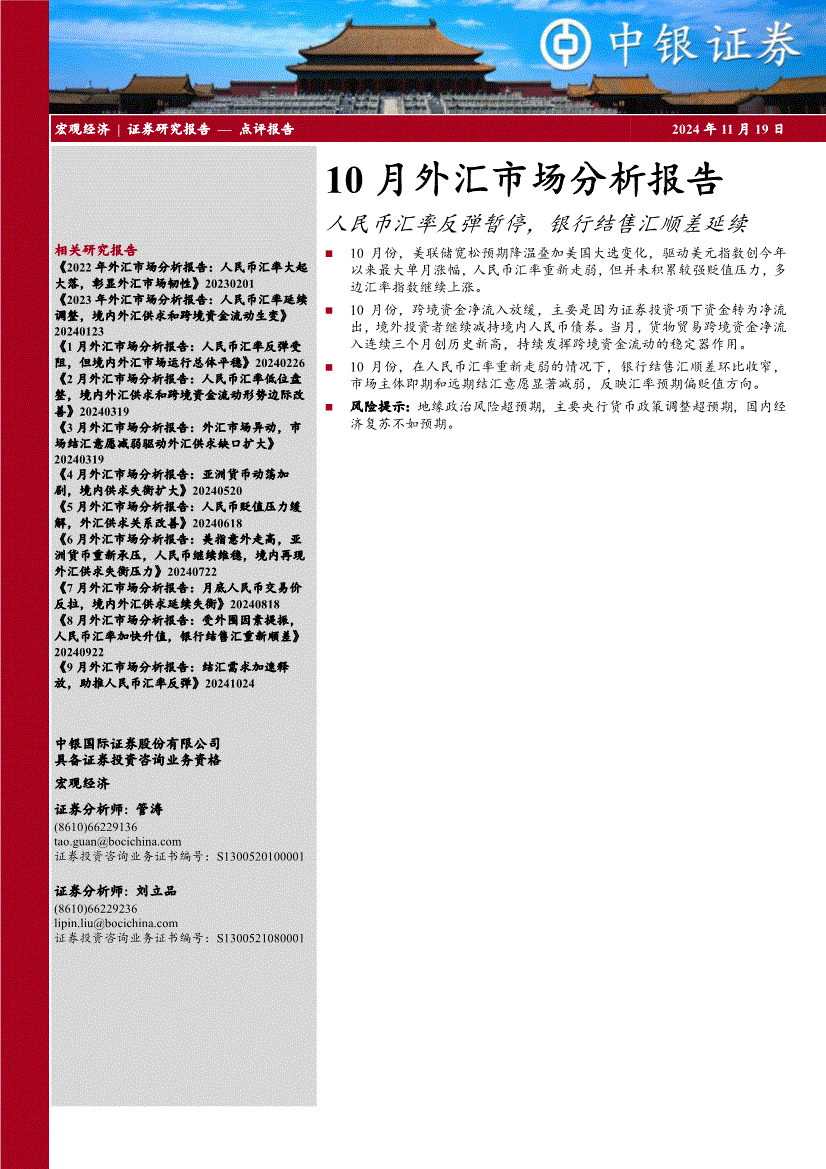 中银国际-10月外汇市场分析报告:人民币汇率反弹暂停,银行结售汇顺差延续-241119