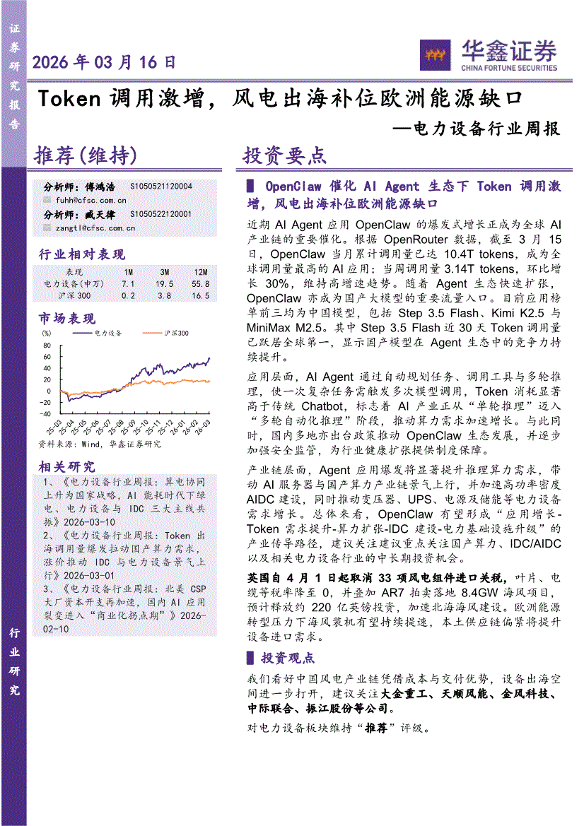 电力设备行业:华鑫证券-电力设备行业周报:Token调用激增,风电出海补位欧洲能源缺口-260316