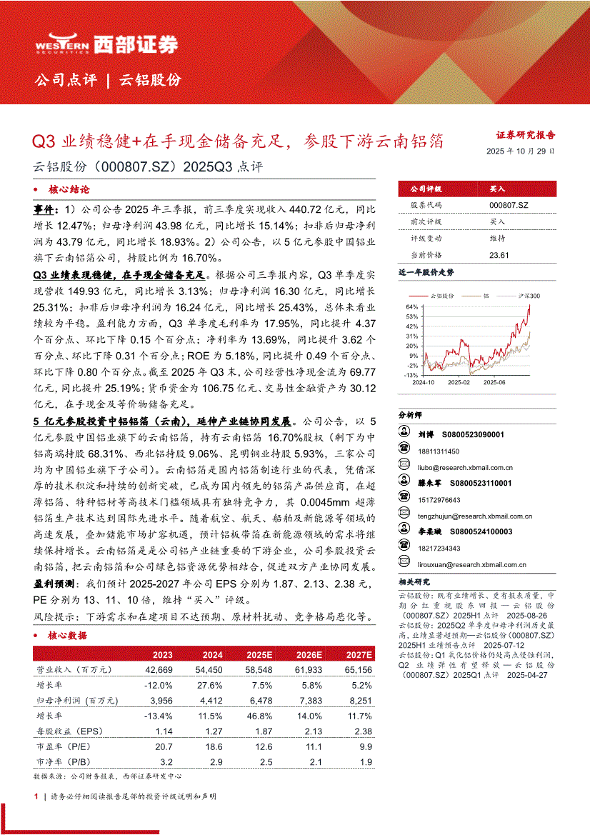 云铝股份:西部证券-云铝股份-000807-2025Q3点评:Q3业绩稳健+在手现金储备充足,参股下游云南铝箔-251029