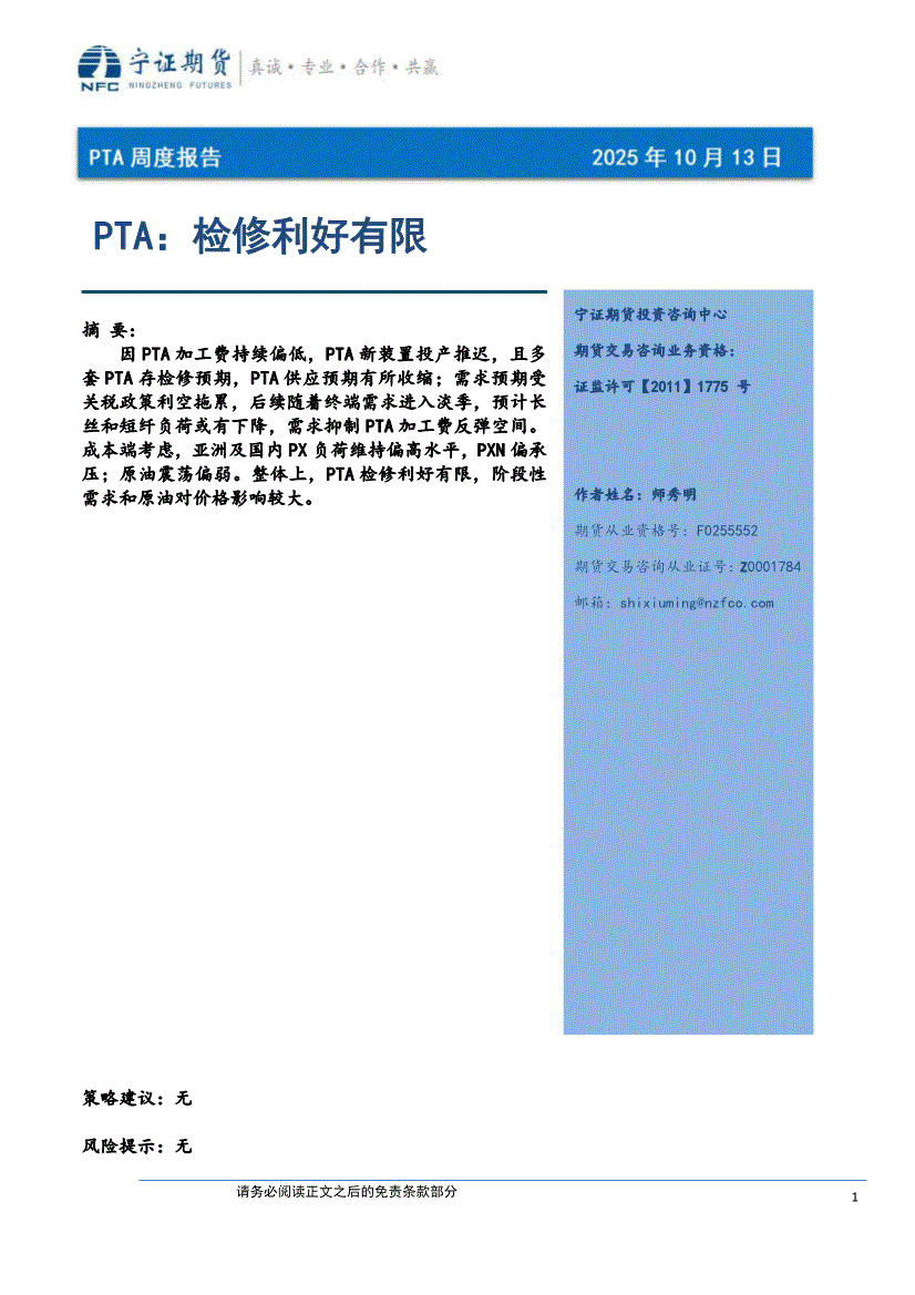 宁证期货-PTA周度报告:PTA,检修利好有限-251013