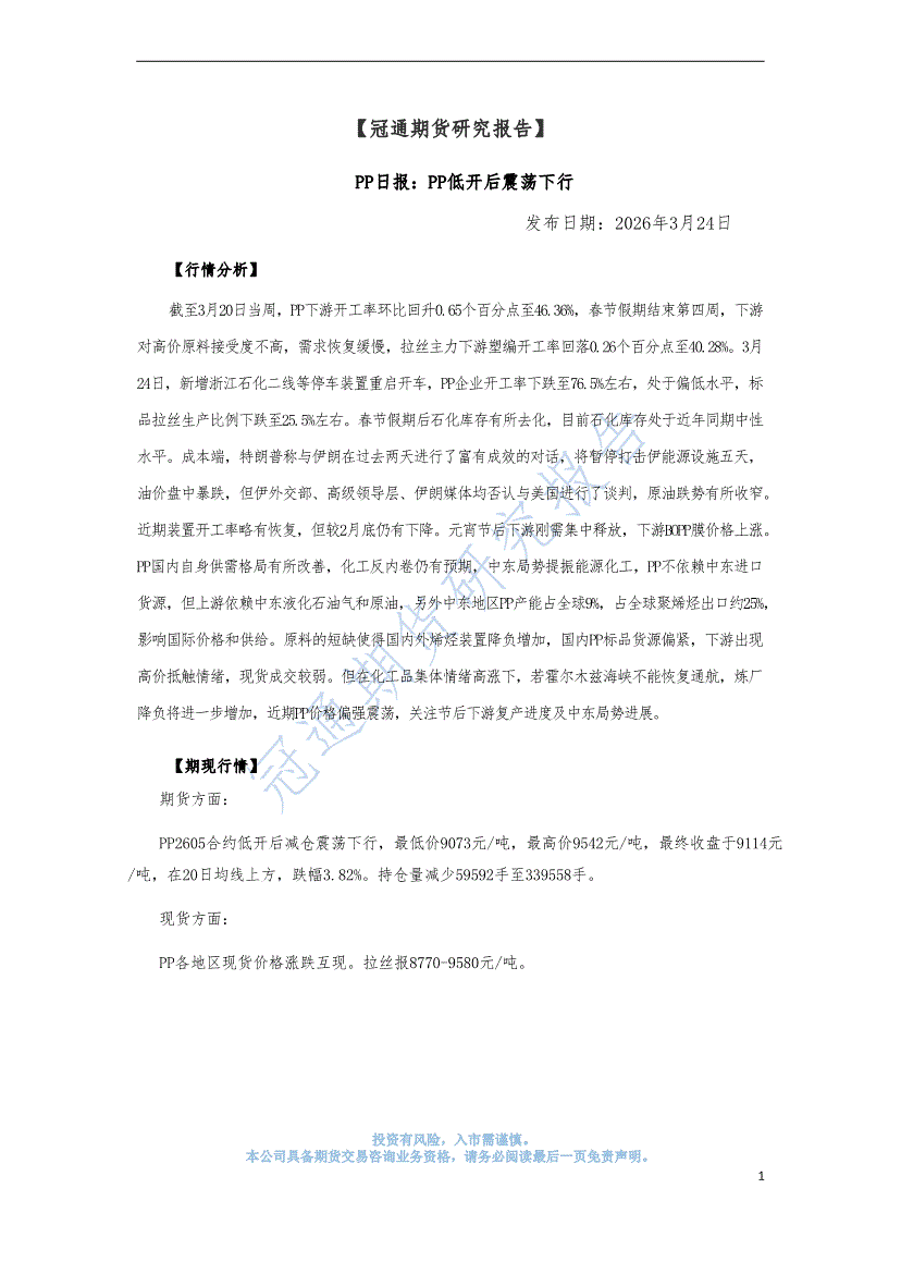 冠通期货-PP日报:PP低开后震荡下行-260324