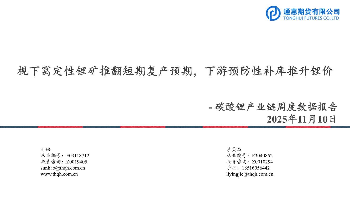 通惠期货-碳酸锂产业链周度数据报告:枧下窝定性锂矿推翻短期复产预期,下游预防性补库推升锂价-251110