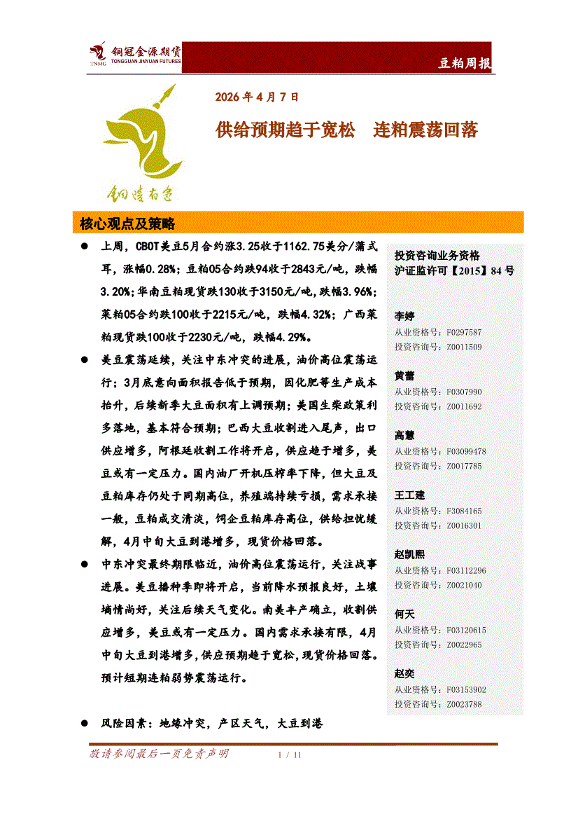 铜冠金源期货-豆粕周报:供给预期趋于宽松,豆粕震荡回落-260407