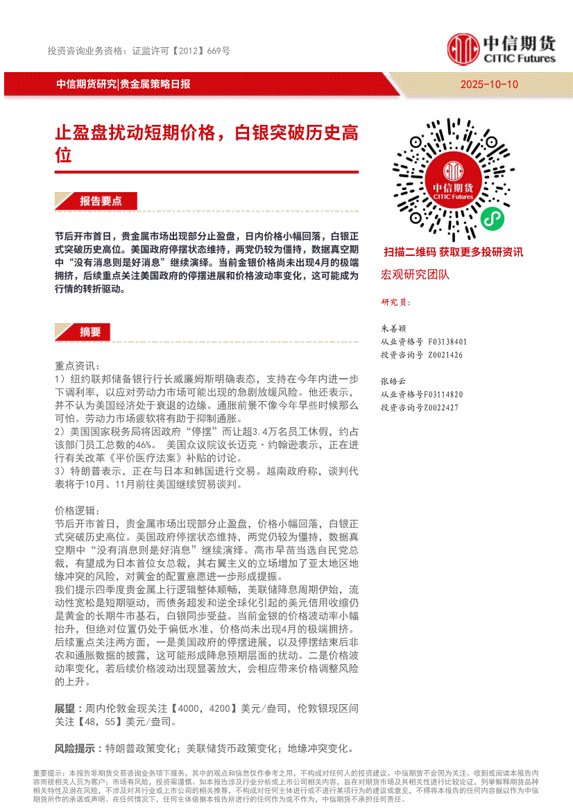 中信期货-贵金属策略日报:黄金突破4000美元关口,关注波动率和 美国政府停摆进展-251009