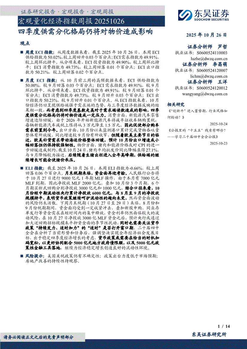 东吴证券-宏观量化经济指数周报:四季度供需分化格局仍将对物价造成影响-251026